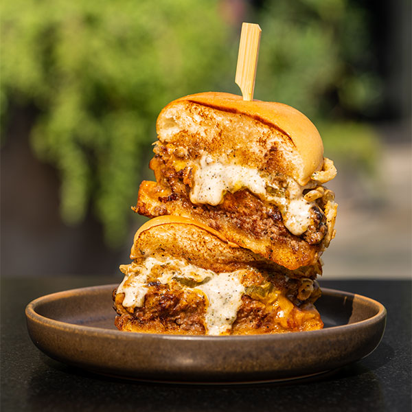 Two Beef Patties, American Cheese, Jalapenos, Onion, Pickles, Sriracha, Gravity Sauce